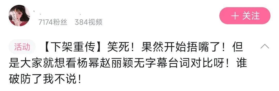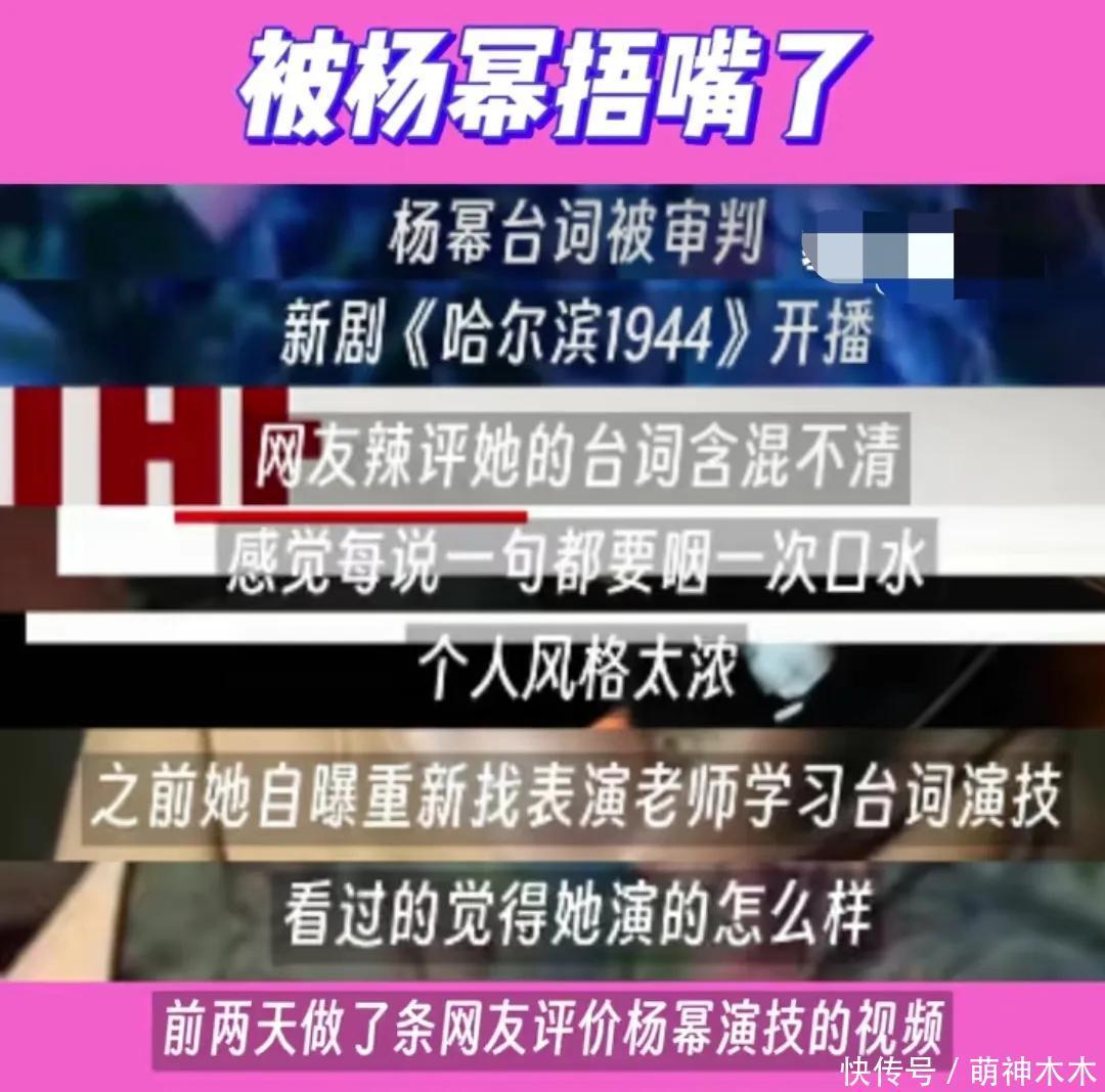 一位短视频博主发了一条名为“被杨幂捂嘴了”的视频,视频中提到博主在前两天作念了一条网友评价杨幂演技的视频,其中齐是对杨幂在《哈尔滨一九四四》中台词的吐槽。
