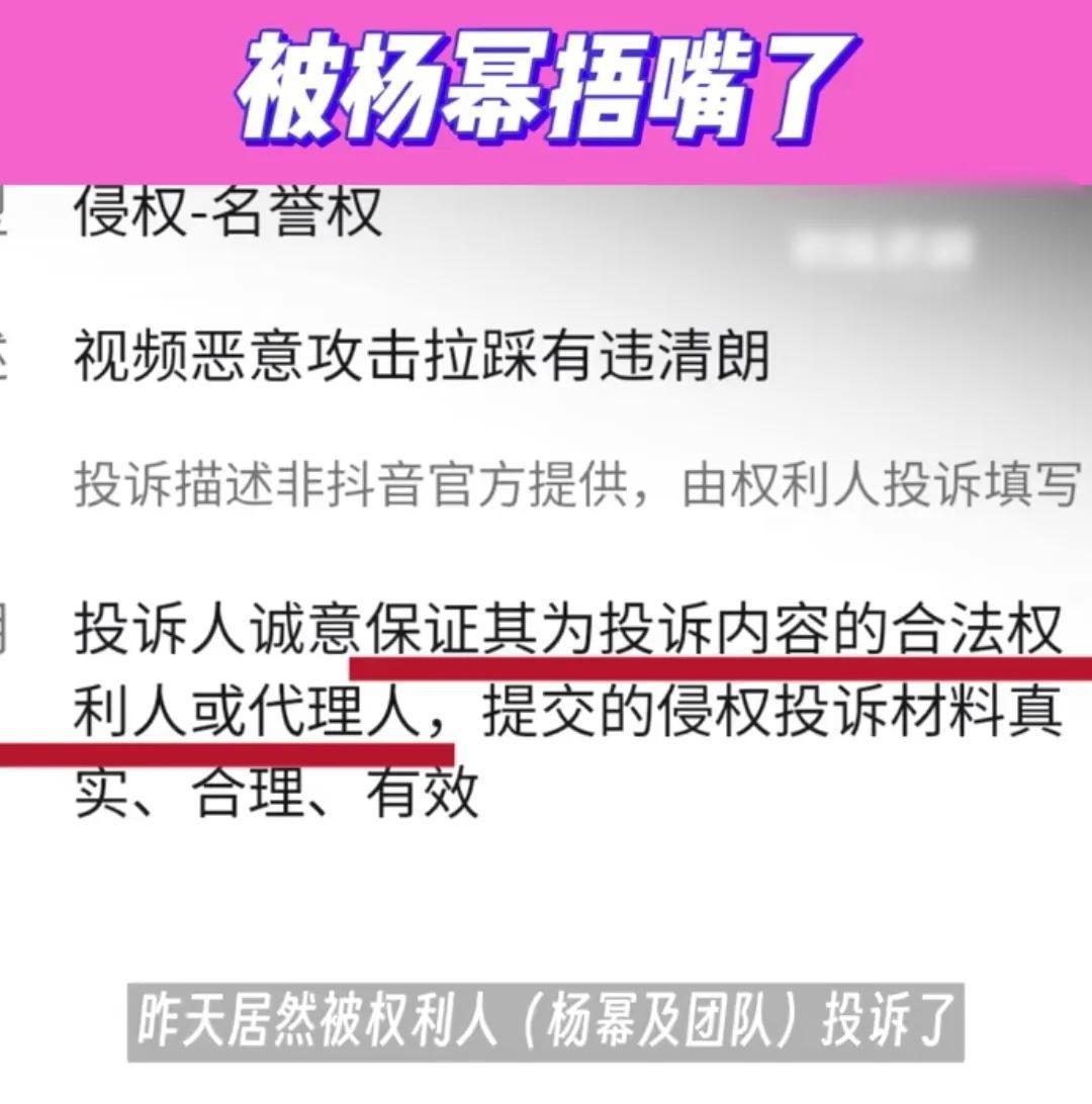 但是,就在视频发布几天之后,该博主的这条视频被投诉了,投诉的意义是扰乱了名誉权,投诉东谈主是投诉实质的正当权柄东谈主或代理东谈主,也即是说杨幂或者杨幂团队举着证件来投诉了。怪不得,博主自称“被杨幂捂嘴了”。