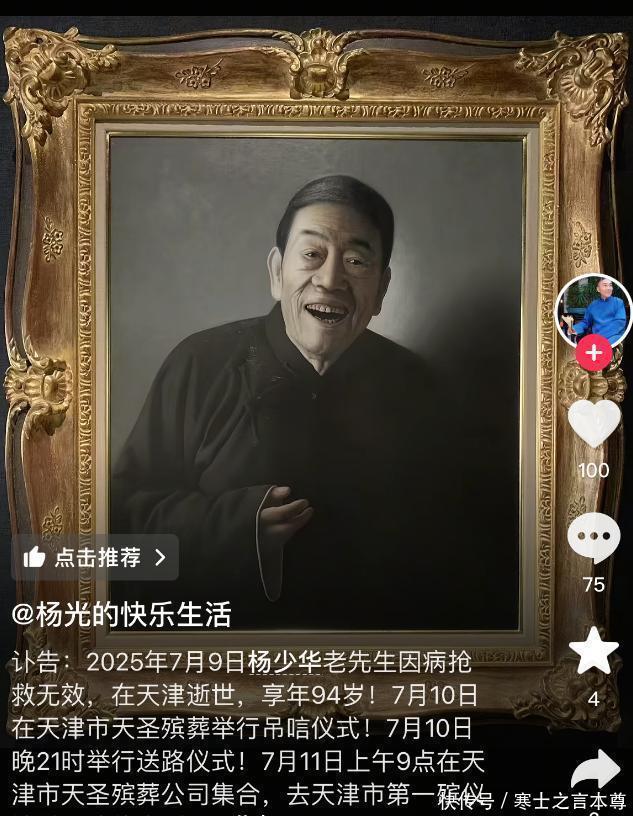 7月9日下昼,北京后生报记者在相声演员苗阜、天津知名相声主抓东谈主小佀老诚处获悉,相声演员杨少华赔本,享年九十四岁。 与杨少华有关短视频账号“杨爷爷的骄气生涯”在今天中午仍在发布带货视频。杨少华赔本音问传出后,网友纷繁赶赴批驳区核实、哀悼。